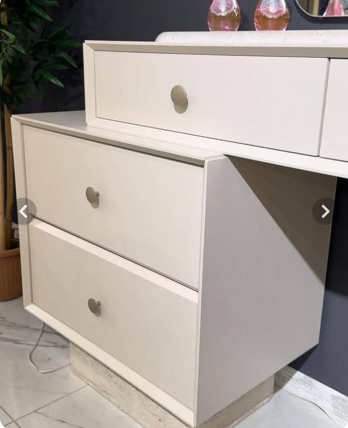 تمامی بدنههای میز آرایش و پاتختی از امدیاف درجه یک ساخته شدهاند و با رنگ پلیاستیر پوشش داده میشوند که هم براقیت و کیفیت بالا دارد و هم در برابر ضربه و خطوخش مقاوم است. همه اجزا از نظر رنگ و ابعاد قابل سفارشسازی هستند.