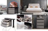در کنار تخت، دو پاتختی مدرن طراحی شده که روی پایه سنگی مینیمال قرار گرفتهاند. نکته منحصربهفرد این مدل، پشتزمینهی پاتختیهاست که از امدیاف با روکش وکیوم درجه یک ساخته میشود و قابل سفارش در طرحهای متنوع است. این طراحی باعث میشود دیوار پشت تخت جلوهی یکدست و هماهنگی داشته باشد.