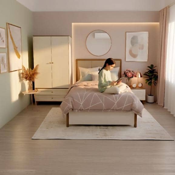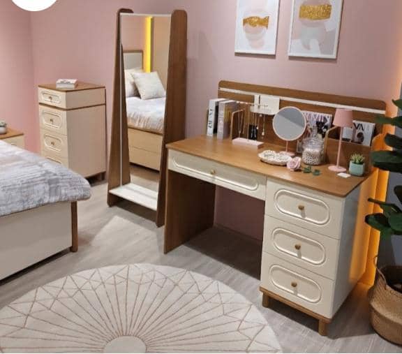 اقلام نیمست سرویس خواب نوجوان عبارتاند از: یک تختخواب با ابعاد 200×120 سانتیمتر، یک عدد پاتختی، یک میز آرایش و یک صندلی میز آرایش.