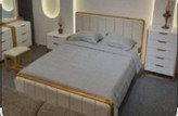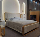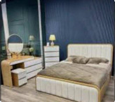 سرویس خواب دونفره مدرن شامل تخت خواب کف تخت فلزی با پایه های متصل، آینه قدی و فایل با صندلی و دو عدد پاتختی می باشد.