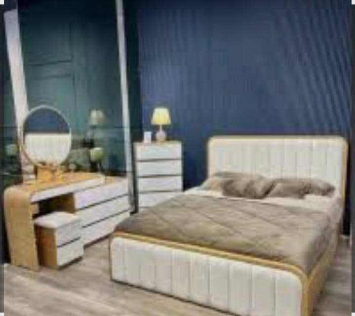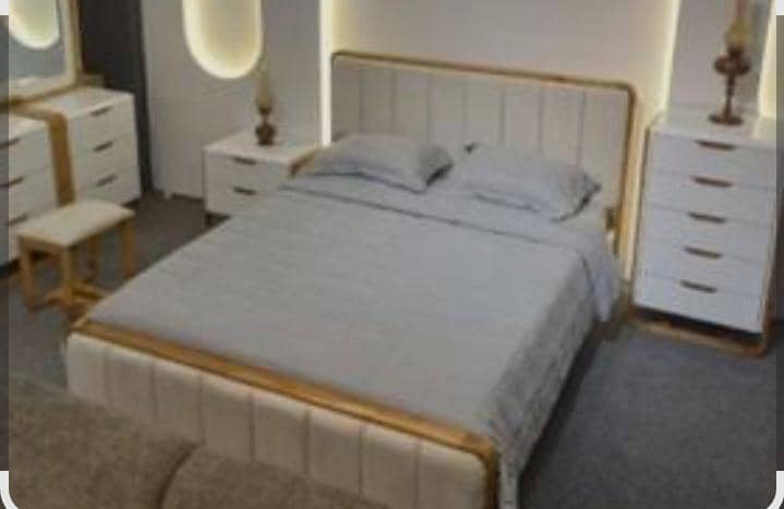 سرویس خواب دونفره مدرن شامل تخت خواب کف تخت فلزی با پایه های متصل، آینه قدی و فایل با صندلی و دو عدد پاتختی می باشد.